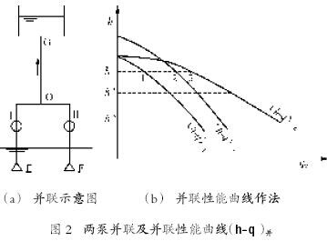 1.1 并聯泵(或風機)的性能曲線(h-q)或(p-q)兩臺或兩臺以上泵(風機)向同一壓出管路壓送流體的運行方式稱為并聯運行,如圖2 所示。