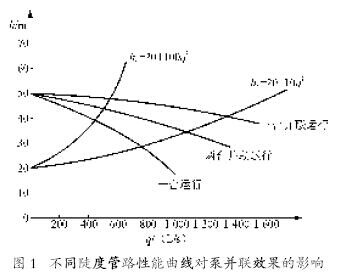 泵或風機并聯運行的主要目的是增大所輸送的流量。但流量增加的幅度大小與管路性能曲線的特性及并聯臺數有關。圖1所示為兩臺及三臺性能相同的20Sh-13型離心泵并聯時,在不同陡度管路性能曲線下流量增加幅度的情況,從圖可見,當管路性能曲線方程為