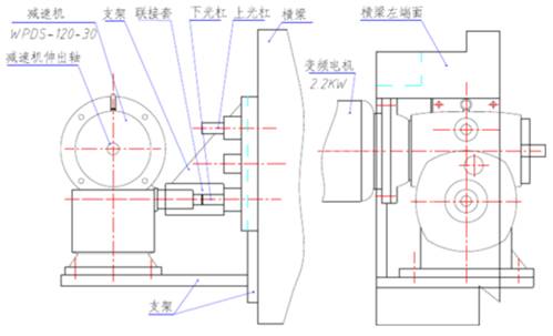 圖二中,控制左溜板的下光杠要與橫梁右端的傳動機(jī)構(gòu)脫開,手柄固定。減速機(jī)輸入帶伸出軸,便于手動調(diào)整。