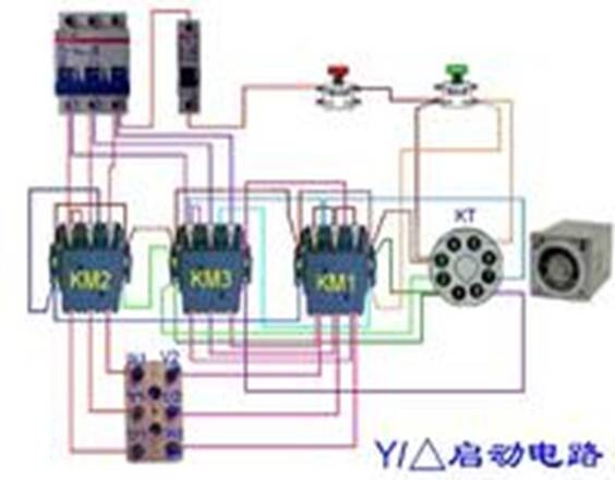 時間繼電器延時到達以后,延時觸點KT-1斷開,KMy線圈斷電,KMY-1斷開,KM通過KM-2仍然得電吸合著;KMY-2斷開,為電動機線圈處于三角形接法作準備;KMY-3閉合,使KM△得電吸合;
