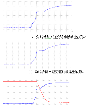 (2)控制電源檢測IGBT逆變器。在IGBT中頻電源裝置中,控制電源與主電源的接通是分開控制的。在只接通控制電源的情況下,先用示波器測量逆變驅動板輸出波形,同一角線橋臂逆變驅動板輸出波形大小、形狀是一致的。若某塊逆變驅動板輸出波形異常,則可通過更換上正常驅動板來檢測該塊驅動板是否損壞,若輸出波形正常,則該驅動板損壞,否則IGBT損壞。其次用雙蹤示波器的2個探頭同時進行測量檢查,探頭CH1逐個測量VT7、VT9、VT11、VT13的驅動板輸出波形,探頭CH2逐個測量VT8、VT10、VT12、VT14的驅動板輸出波形,在二條角線橋臂波形的全部交匯點一致的情況下,才可以判斷全部IGBT工作基本正常。用示波器測得的逆變驅動板正常輸出波形如圖2所示。