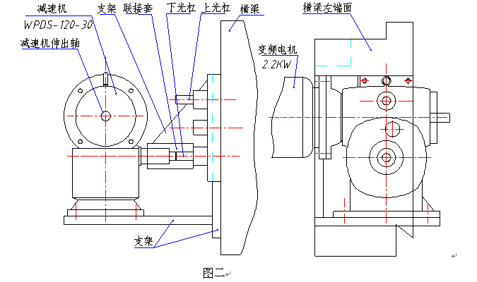 圖二中,控制左溜板的下光杠要與橫梁右端的傳動(dòng)機(jī)構(gòu)脫開,手柄固定。減速機(jī)輸入帶伸出軸,便于手動(dòng)調(diào)整。